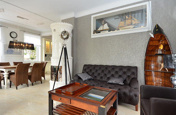 Die rechte Doppelhaushälfte „Classic“ empfängt Sie mit einem friesisch-nordischen Eingangsbereich.Von dort aus gelangen Sie in den großzügig und gemütlich eingerichteten, hellen Wohn- und Essbereich. Verschiedene Stukkaturen an Decken und Wänden sowie Liebe zu ausgesuchten Details verleihen dieser Haushälfte einen besonderen Stil. Sinnbild für ein maritimes Lebensgefühl stellen Modellschiffe und diverse „zum Meer gehörige“ bilder dar. Der große schwedische Kachelofen und der Blick in den Garten sind «Wellness für die Sinne» und sorgen für Ambiente und Wohlbehagen. An den Wintergarten schliesst sich die große Terrasse zur Südwestseite mit Panoramablick an.